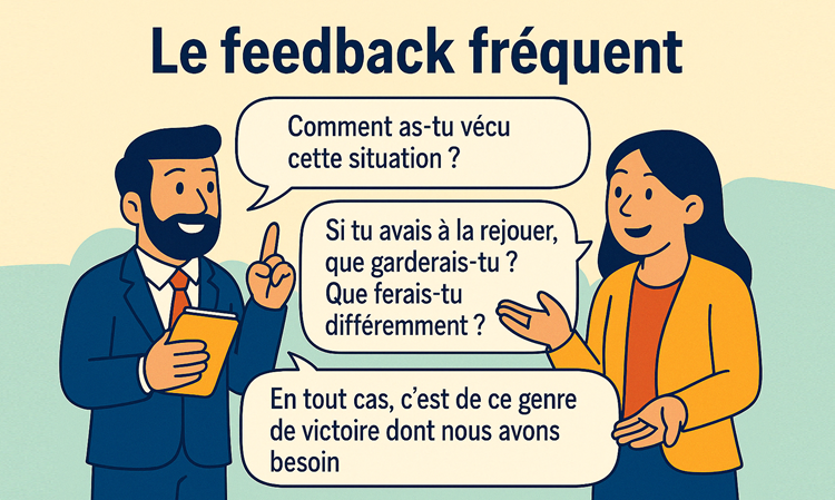 Le feedback fréquent consiste à donner des retours réguliers, courts et ciblés, plutôt que d’attendre une évaluation formelle ou une occasion exceptionnelle. Il s’agit de créer une culture du dialogue permanent, où les progrès comme les ajustements sont abordés en temps réel, de manière naturelle et constructive.